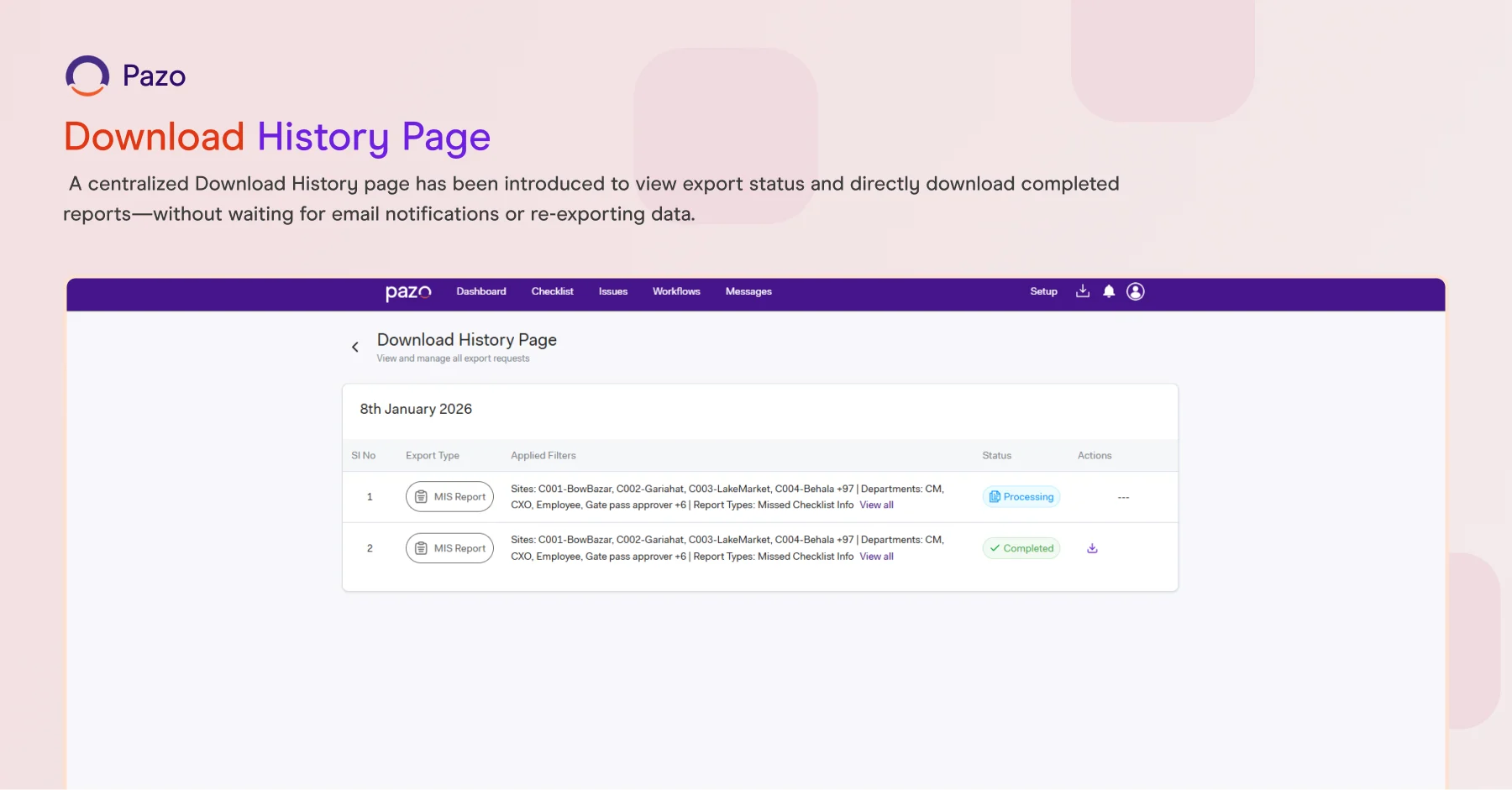 Introduces a centralized page to track export status and download completed reports directly.